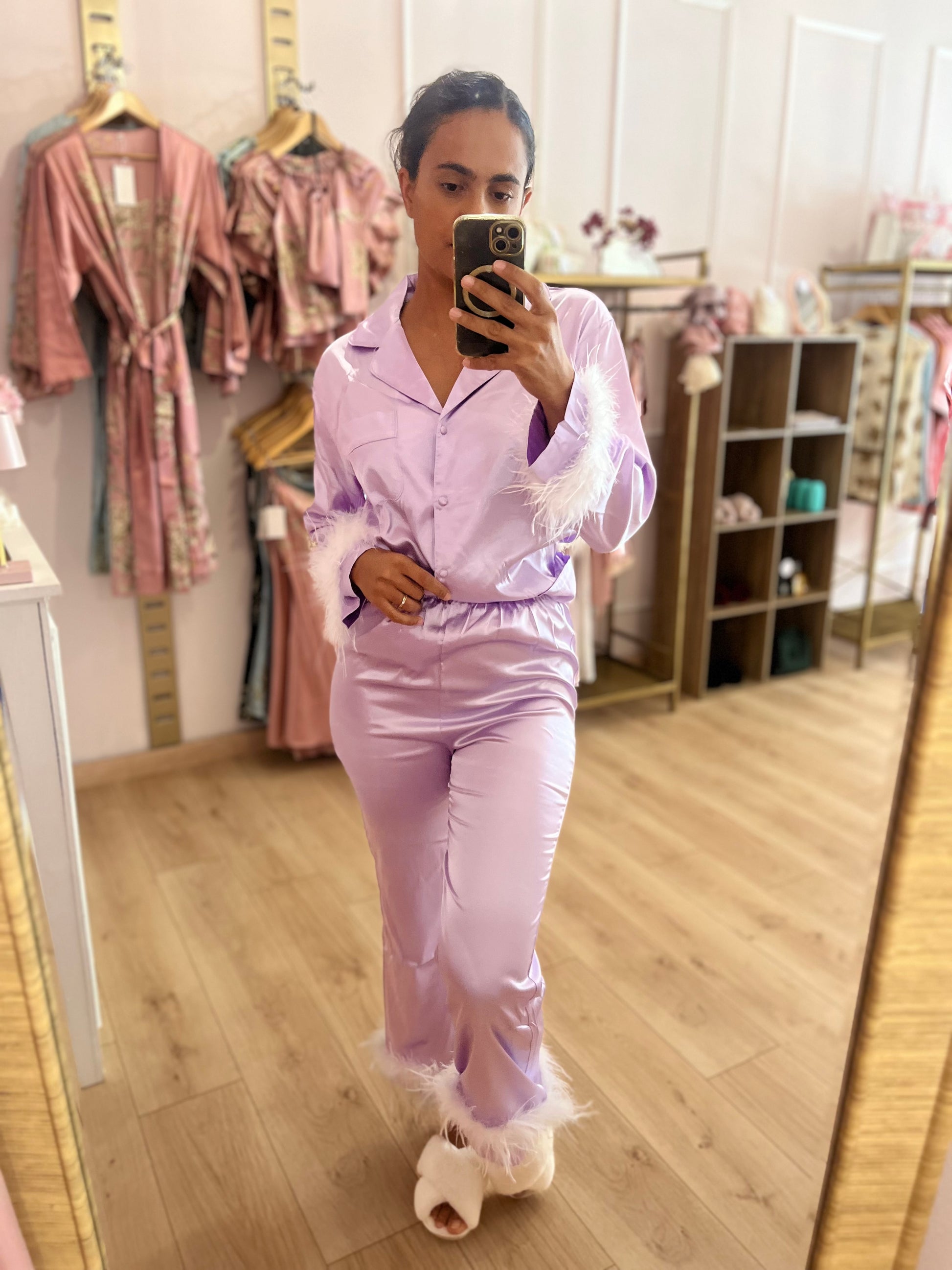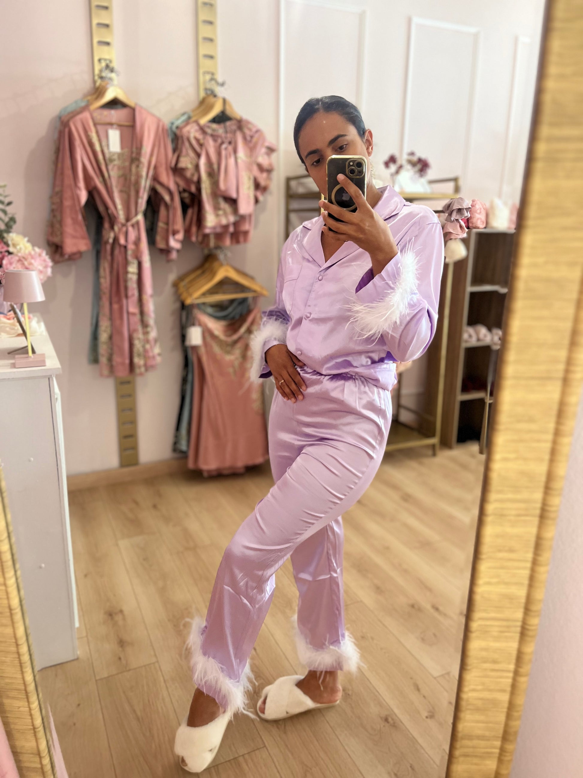 Les finissions en plumes délicates aux poignets et aux chevilles apportent une touche glamour et sophistiquée, transformant ce pyjama en une véritable pièce de homewear chic. Pensé pour les femmes qui aiment l’élégance jusque dans les moindres détails, il est idéal pour les soirées cocooning, les moments de détente ou comme pièce d’exception pour un trousseau ou un cadeau raffiné.